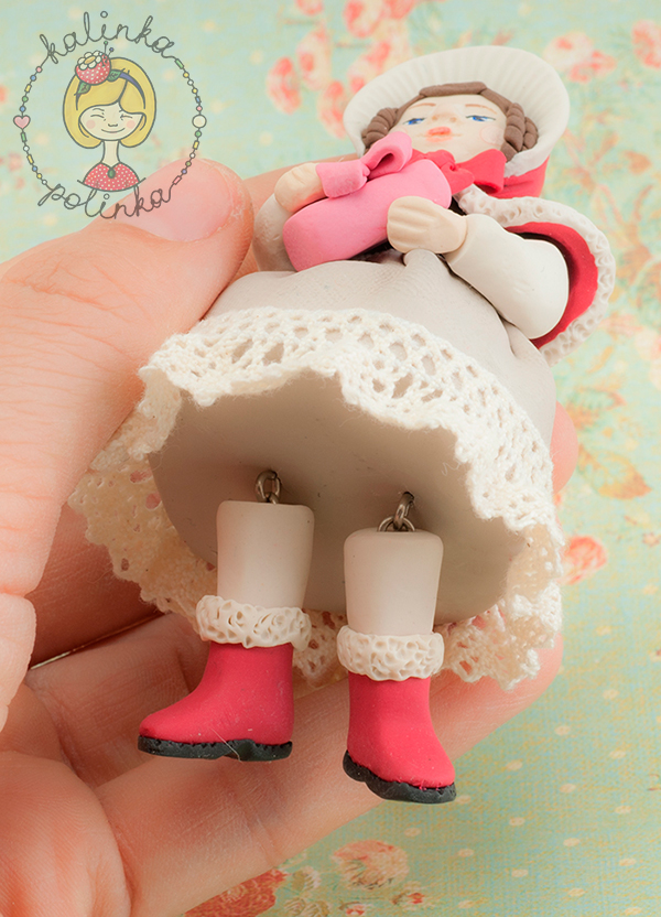 10. Декор головы я вылепила на запеченном лице- сначала волосы, потом шляпку, запекла повторно вместе с телом. После запекания деталей, ноги вкручиваю в дно юбки. Куколка сможет принимать некоторые позы. По краю юбки приклеиваю настоящие кружева.