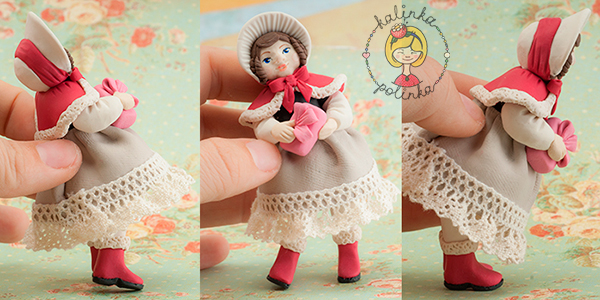 Теперь я уточняю роспись лица и дополняю узорами юбку и шляпку самой тонкой кисточкой. Куколка готова. Экспериментируйте!