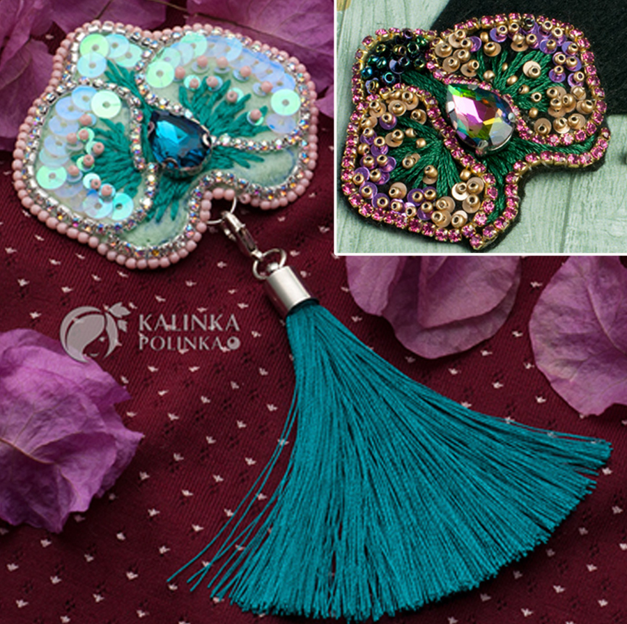 Работа закончена 🤩 Для примера мы показывали одну и ту же брошь орхидею из бисера. Но по нашему шаблону можно сделать очень разные украшения. Использовать бисер и пайетки других цветов. Другой фетр. Другие стразы. И другие дополнительные украшения, кончено же. Взгляните, что получается.